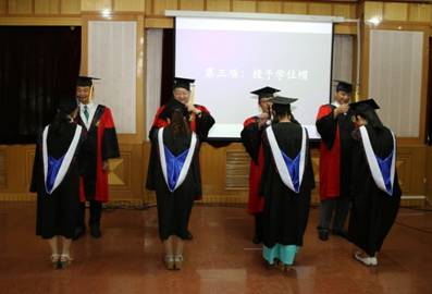 颜虹副校长、王子明副主任、耿剑平书记和张明处长上台为全体毕业生举行授帽仪式,拨流苏。