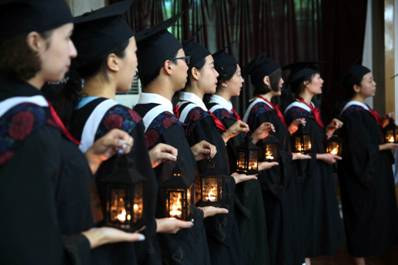 最具特色的环节是点灯仪式。医学部护理学系主任李小妹为学生代表惠沼沼同学点亮南丁格尔之灯,毕业生依次点亮自己手中的南丁格尔之灯,宣读青春誓言。